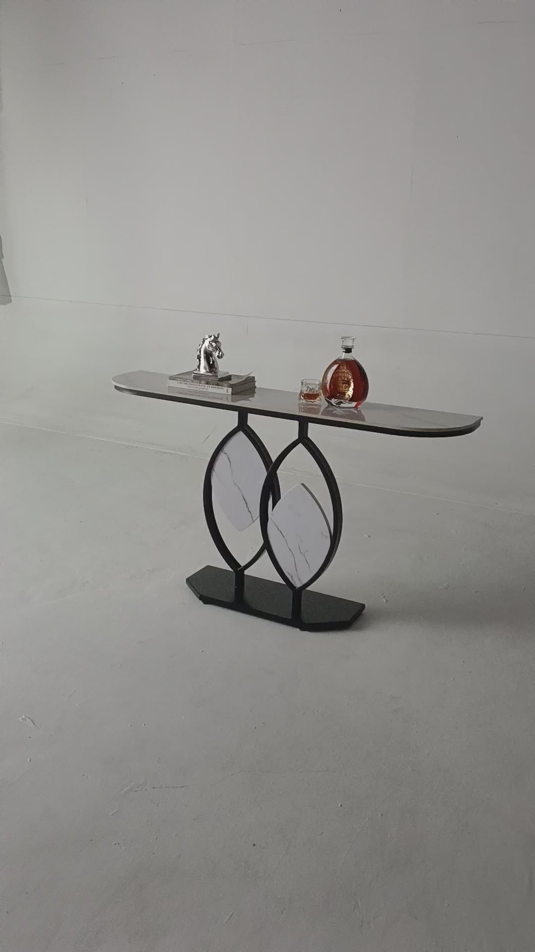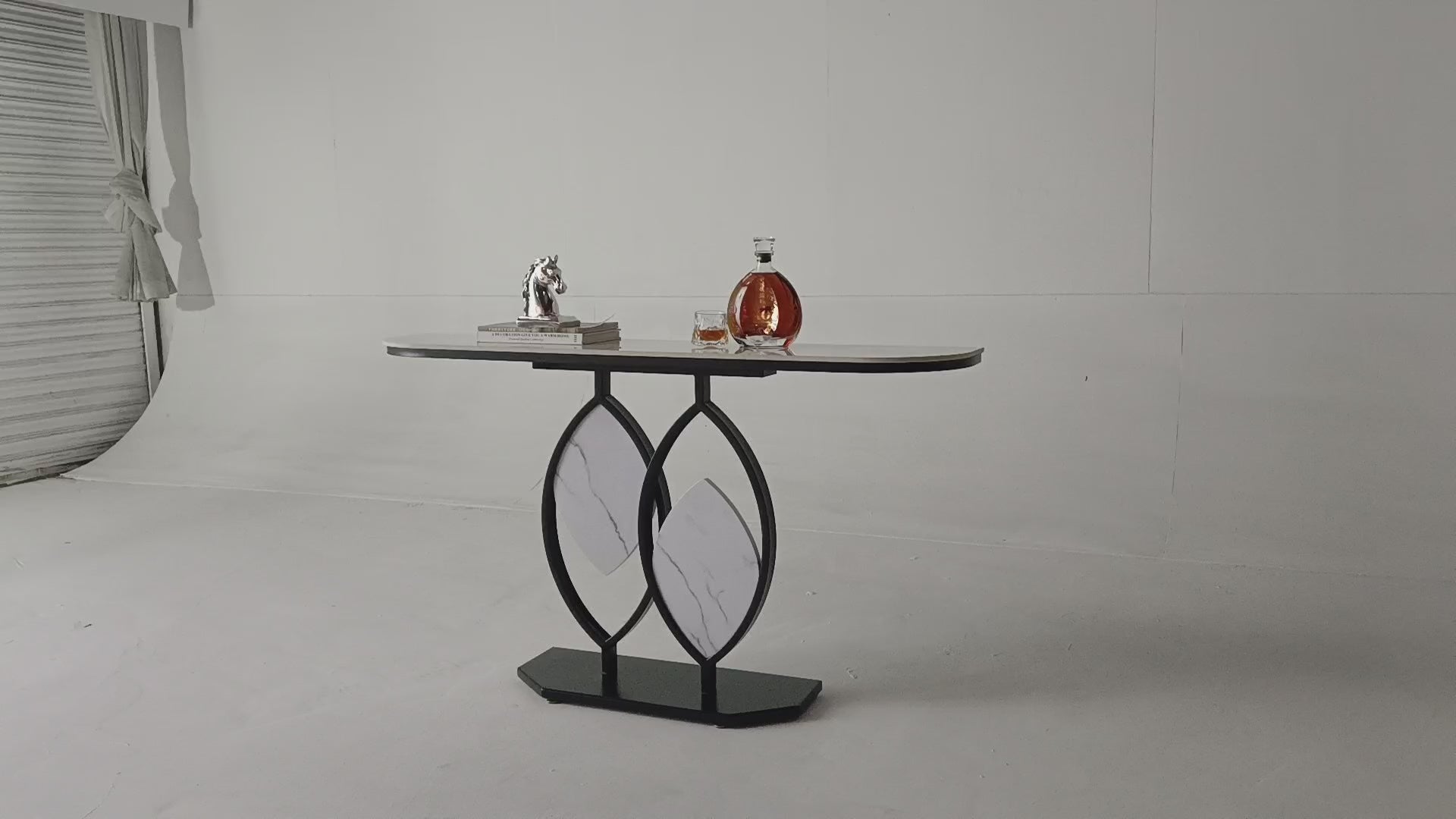 Infuse your space with a touch of Art Deco and Nouveau sophistication with this elegant console table. Featuring simple geometric shapes, solid carbon black steel supports, high-density boards, and snowy mountain white ceramic tops, this table combines durability with a refined aesthetic, making it a perfect addition to any modern interior.