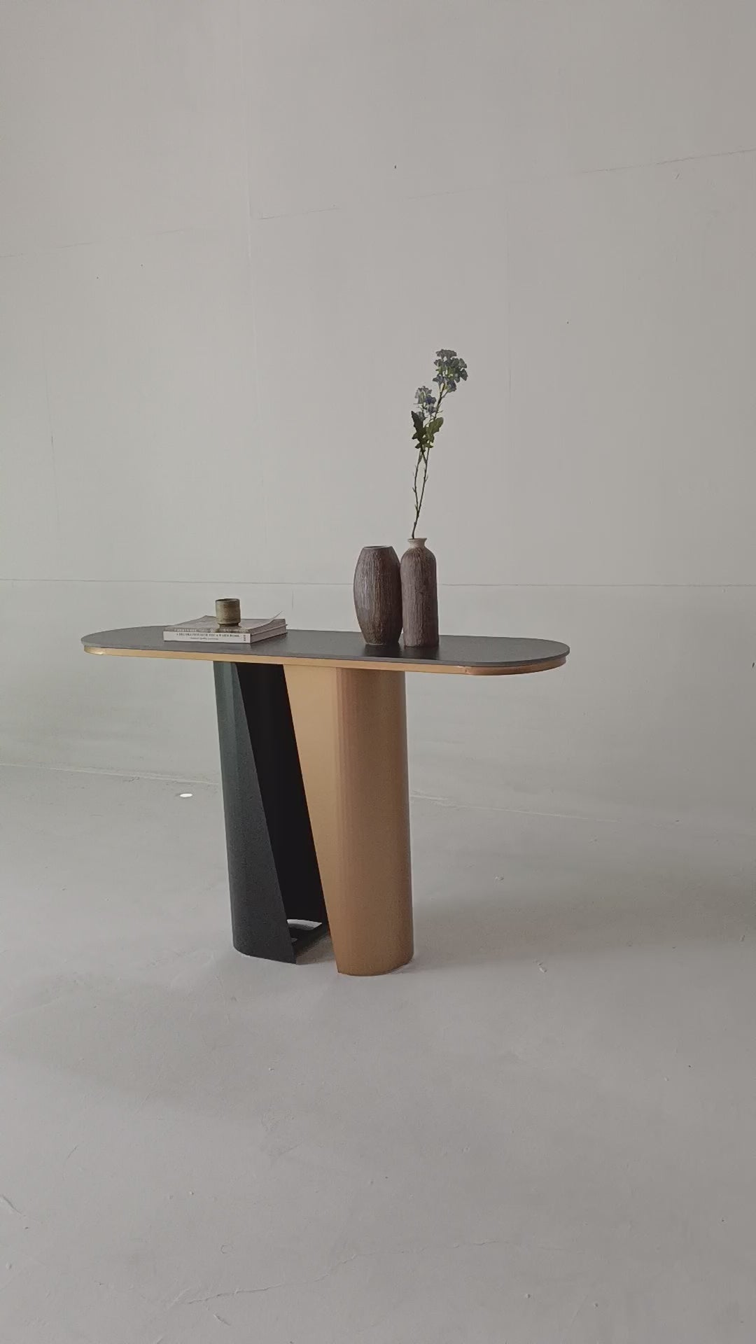 Introduce a blend of art deco elegance and modern style with this exquisite console table. Featuring simple geometric shapes, shimmering antique gold accents, and subdued black ceramic panels, this table is the epitome of sophisticated design, making it a standout addition to any contemporary space.