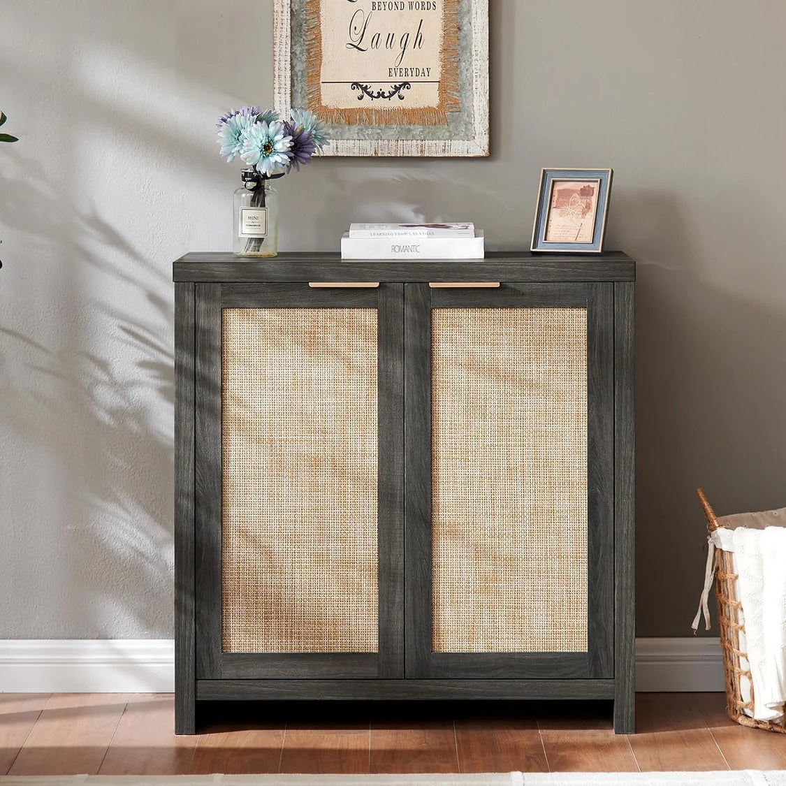 Elevate your home decor with sideboard cabinet, a seamless blend of modern and farmhouse aesthetics. This chic accent cabinet features charming rattan doors, an oak wood grain veneer finish, and sophisticated gold handles, exuding a timeless boho-chic style. The built-in height-adjustable shelf offers versatile storage options, making organization effortless. Designed to enhance any space, it functions perfectly as a living room credenza, dining room console table, kitchen cupboard, or entryway shoe storage cabinet.